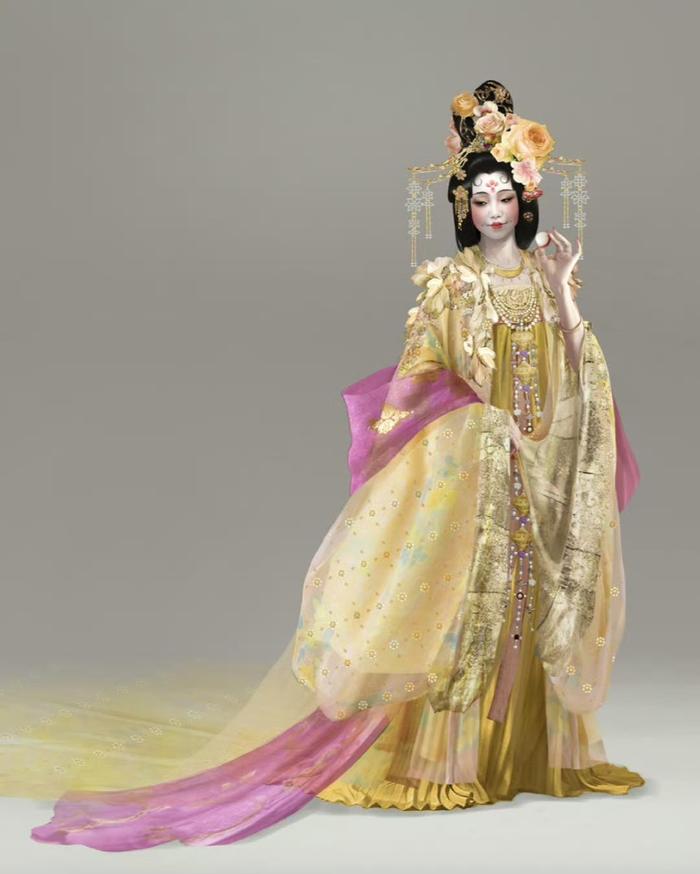 那么,导演大鹏此前是否有考虑过让某个演员来饰演杨贵妃呢?7月23日,大鹏在微博中发文称,他本想让李雪琴来饰演杨贵妃,还晒出了一张设计稿。只见设计稿中,杨贵妃穿着黄色的华服,满头珠翠,优雅地站在画面中,手拿一颗荔枝。