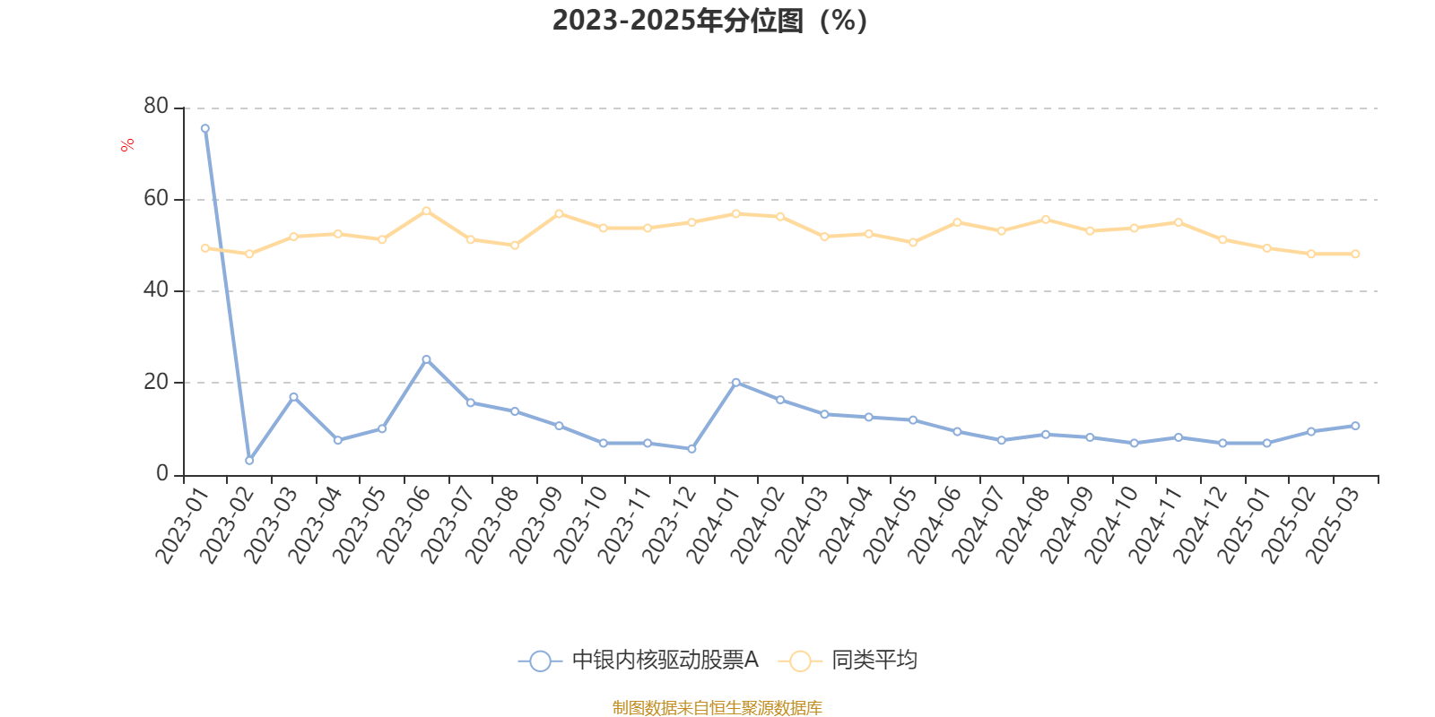 通过所选区间该基金净值增长率分位图,可以观察该基金与同类基金业绩比较情况。图为坐标原点到区间内某时点的净值增长率在同类基金中的分位数。