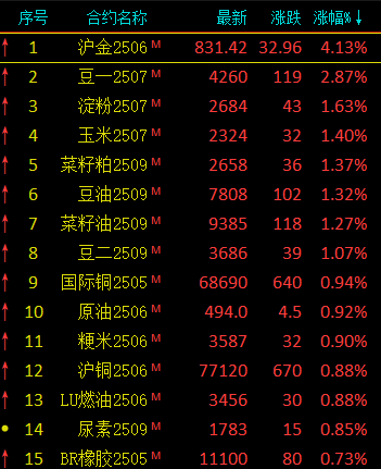 今日,国内商品期货各板块走势分化。其中,黑色系品种普遍大幅下挫,农产品表现“冰火两重天”,玉米、豆类等进口依赖度较高的品种价格坚挺,而原木、红枣等品种则大幅下跌。尤为引人瞩目的是,避险品种黄金期货价格今日再创新高,主力合约AU2506盘中价格强势突破830元/克关口。